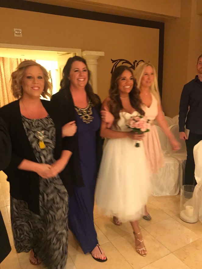 The first two nights, we spent apart for a bachelorette/bachelor party. The last evening, we all reunited for the vow renewal. Because this was just friends, Kelly had me and our two other friends walk her down the aisle. It was a beautiful ceremony and evening!