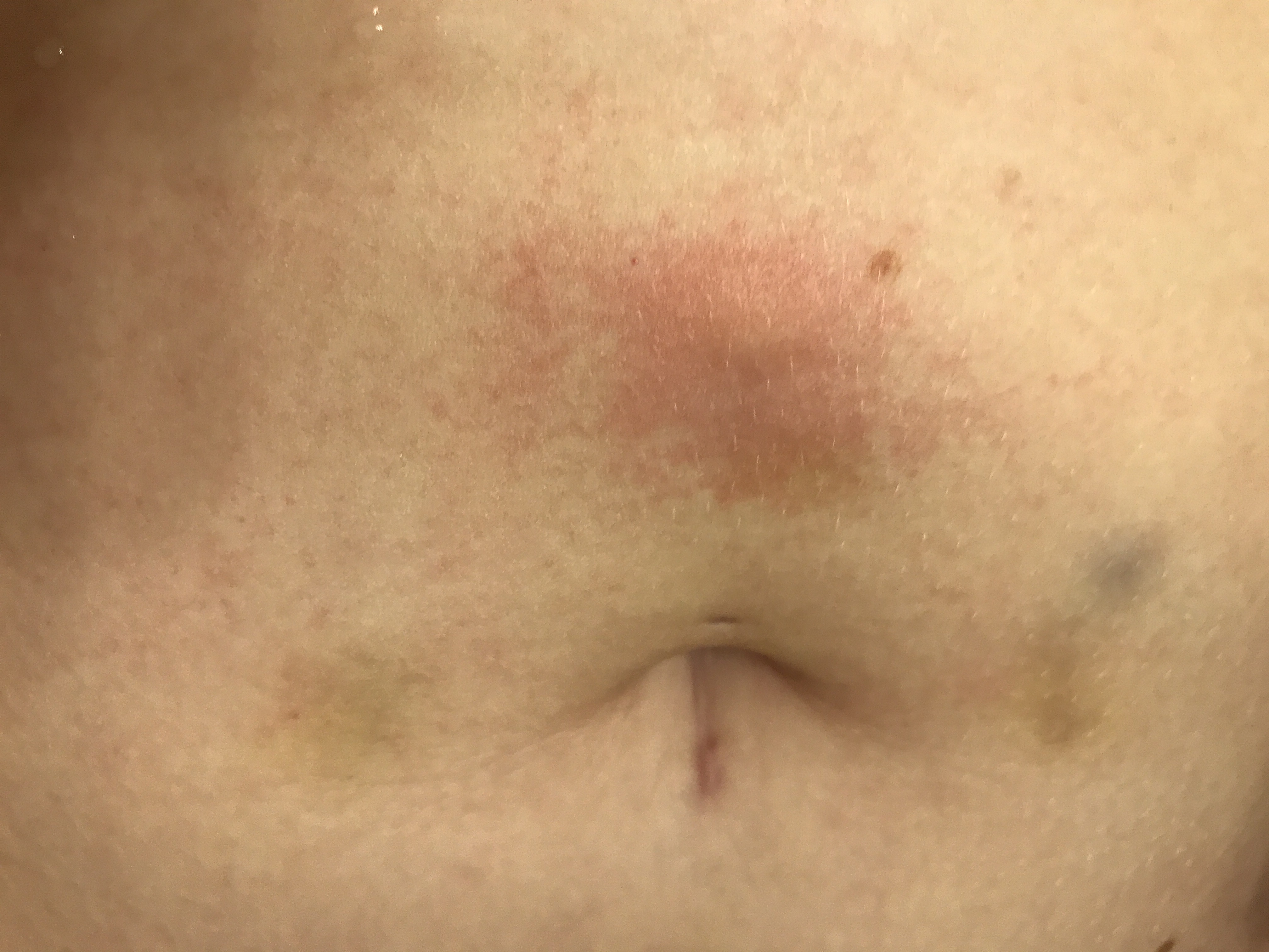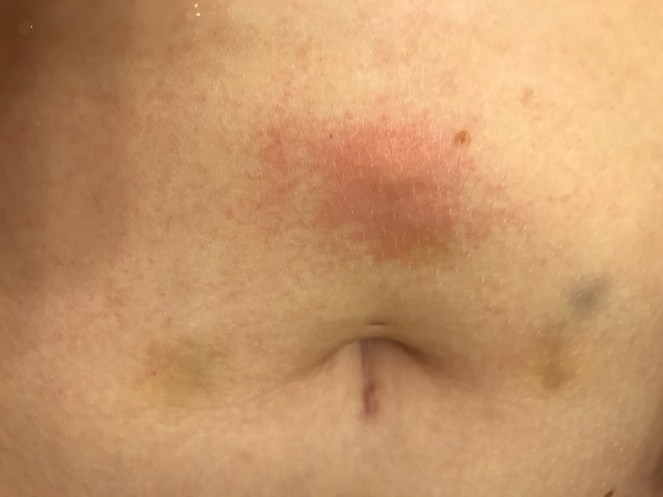 Anyway, I messed up my shot this AM (2ce a day now) and have a little bubble and irritation. You can see my weird, post-surgical, forever changed belly button, too. (Top hole was my piercing, bottom thing is a scar.) Appointment is at 9, so I’ll update later.
