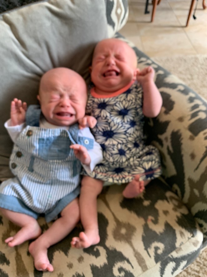 The one of them crying together 😂😂🤣 I know it’s frustrating when you’re trying to comfort them, but if you take a step back they’re all just moments making precious memories. I cried for 5 hours straight every night the first month of my life, but my mom still likes me and I cry slightly less than that now.